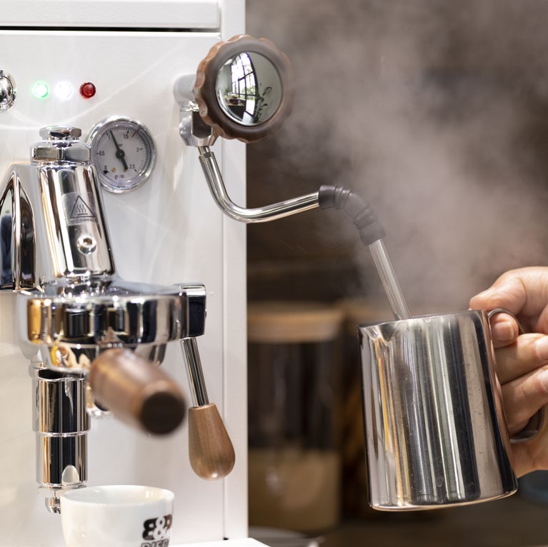 Sara is a single coffee machine with real personality: constructed entirely in polished stainless steel with WALNUT handles and knobs, it is a semi-automatic espresso machine equipped with a professional E61 group.